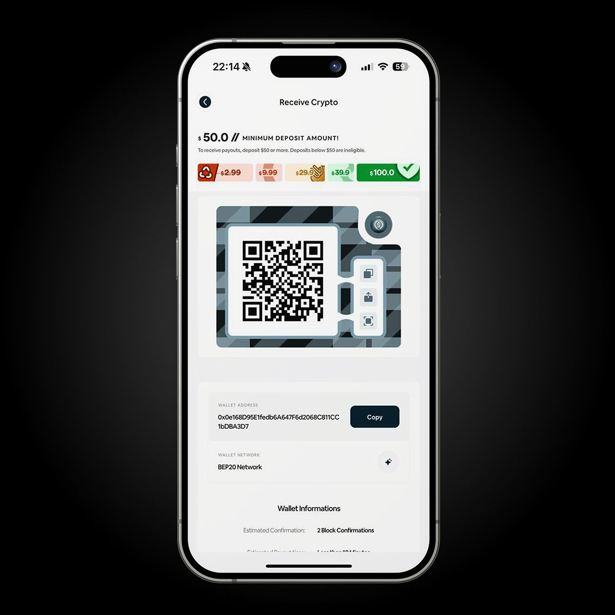 Copy or share your new USDC wallet address. Send your tokens directly to this address. Remember that the minimum trade amount is $50. Read the alert and tap “Got it” to proceed.